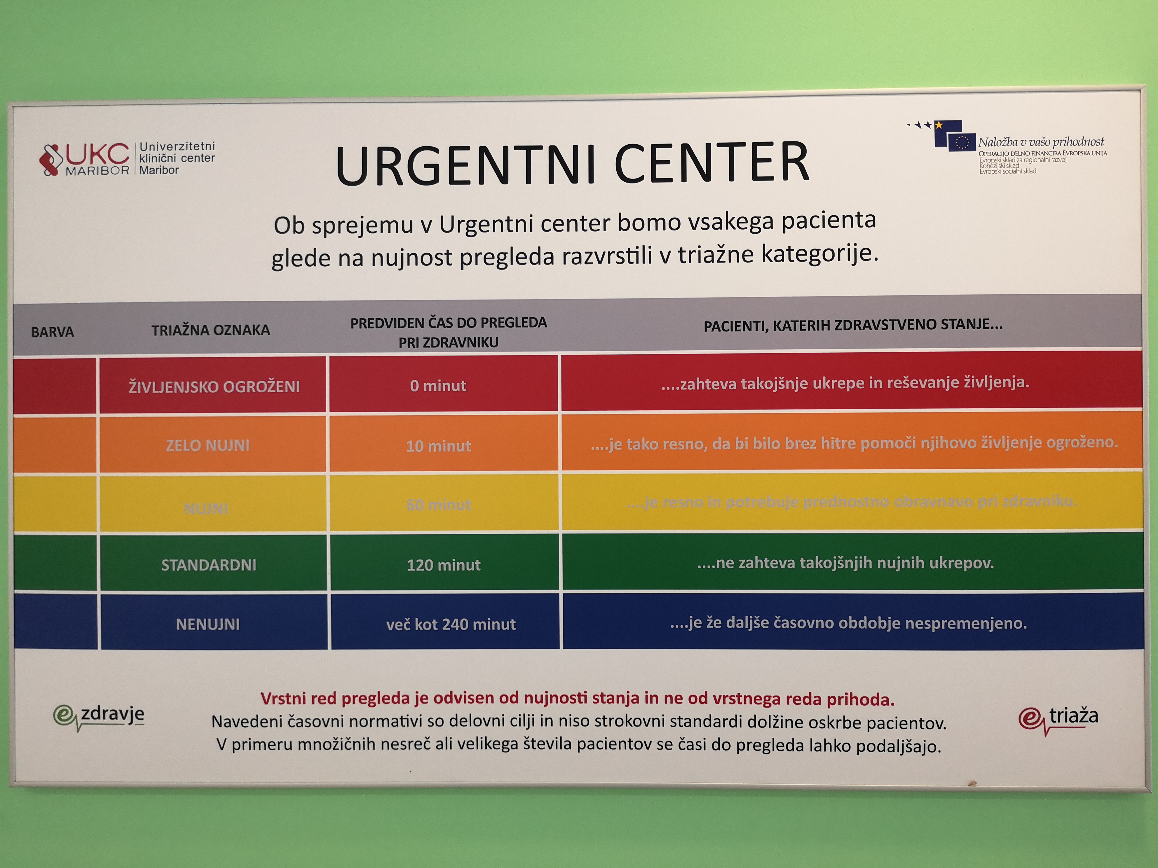pregled takoj, oranžna - pregled v 10 minutah, rumena - pregled v 60